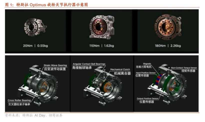 特斯拉Optimus的旋转关节方案:无框电机+谐波减速器+扭矩传感器+位置传感器+轴承(角接触球轴承+交叉圆柱滚子轴承)+编码器。特斯拉同步展示了其执行器产品组合,包含了3个不同扭矩的旋转减速器,分别为20Nm/110Nm/180Nm。