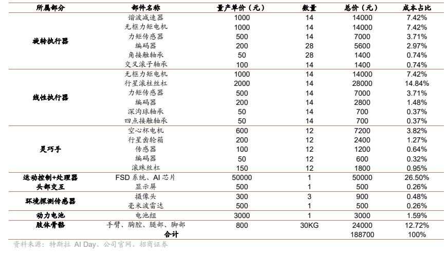 灵巧手:包含空心杯电机、行星齿轮箱、传感器、滚珠丝杠等,成本占比约为7%;肢体骨骼:力学结构件,成本占比约为13%。