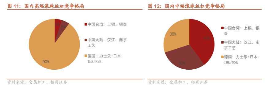 滚珠丝杠:滚珠丝杠发明于1874年,20世纪30年代,美国通用公司在汽车的转向装置上首次应用了滚珠丝杠元件,20世纪40年代,滚珠丝杠副首次在数控机床上得到使用,并成为了数控机床的理想进给元件;伴随机床和自动化设备的发展,对滚珠丝杠副的研究和生产得到推进,50年代开始在工业发达国家出现众多滚珠丝杠副厂家,如英国ROTAX、日本NSK等。我国研制用于数控机床的滚珠丝杠副起步于20世纪50年代,1964年我国自行设计研制第一套滚珠丝杠副,自2009年国家启动相关课题开始,国内企业如汉江机床、山东博特精工等已经取得了许多优秀的成果,但目前我国在高性能产品上与世界先进企业相比仍有进步空间,在国内市场上,中高端滚珠丝杠市场主要由德国和日本企业占据,THK、NSK、力士乐等国际企业可以占据高端市场90%的市场份额,而中国大陆企业主要活跃在中端市场,约占30%的市场份额。主要原因为我国企业规模小,起步晚,在产品质量上达不到高精度水平。