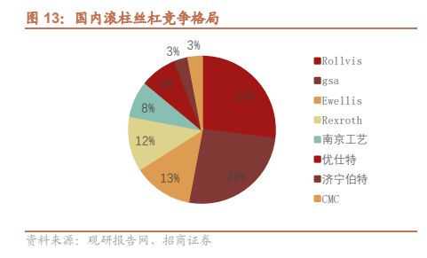 行星滚柱丝杠:1942年,瑞典人CarlBrunoStrandgren首次申请了循环式行星滚柱丝杠专利,1954年申请了标准式和反向式行星滚柱丝杠专利,1986年,发明了差动式行星滚柱丝杠,之后OliverSaari发明了轴承环式行星滚柱丝杠。1970年,瑞士的Rollvis公司开始研制行星滚柱丝杠,瑞典的SKF也同时研制行星滚柱丝杠,美国的Moog、德国的Ortlieb和英国的PowerJacks等都有各自成熟的行星滚柱丝杠产品;美国的Exlar和德国的Rexroth都将行星滚柱丝杠运用到各自的机电作动器中。2022年日本、欧洲滚柱丝杠企业在中国市场占有率高达90%。根据观研报告网数据,2022年我国行星滚柱丝杠市场供应量排名前四的厂家分别是Rollvis(瑞士)、GSA(瑞士)、Ewellix(瑞典)Rexroth(德国),市占率分别为27%、26%、13%,12%。由于我国企业在该行业起步晚,竞争实力距离国外工业发达国家企业有较大差距。