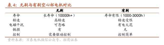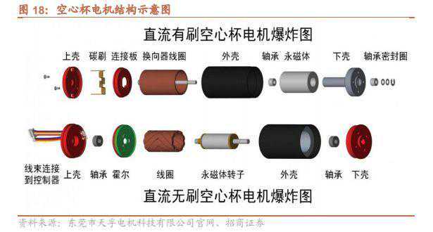 空心杯电机趋势:有刷→无刷。有刷电机采用机械换向,随着电机旋转,电刷沿着换向器滑动,产生动态的磁场,但也由于电刷和换向器存在相对滑动,容易损耗;无刷电机通过驱动器实现电子换向,因不存在电刷,被称为“无刷电机”。