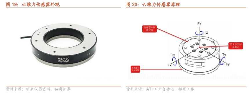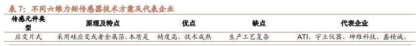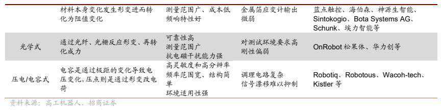 根据传感元件的不同,六维力矩传感器主要分为应变片式、光学式、压电/电容式;目前大部分六维力矩传感器是基于应变式的测量,基于电压电容和光学原理的传感器有一定的理论研究和试验,下游尚未得到广泛应用。