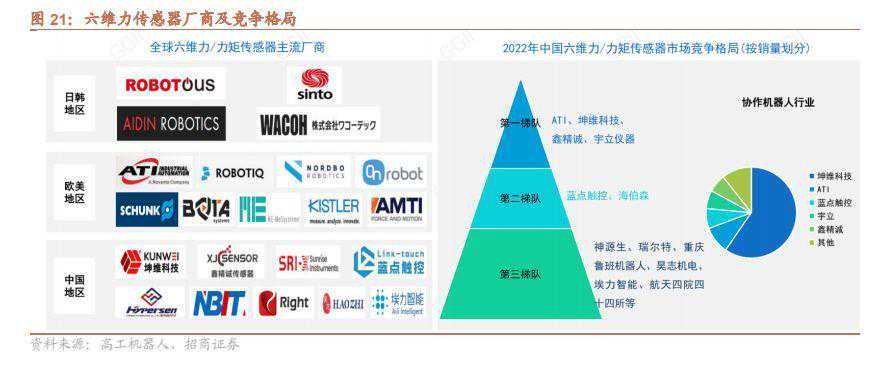 中国六维力矩传感器市场近年来入局者逐年增加,单受限于该行业的高技术壁垒,真正具备批量供应能力的厂商依然较少,根据2022年国内销量口径,ATI、坤维、鑫精诚、宇立位于第一梯队,各家厂商下游应用的侧重有所差异。ATI作为全球龙头,经过多年积累,应用面相对更广,宇立在工业机器人磨抛行业和汽车碰撞测试行业应用较多;坤维在协作机器人、医疗手术机器人、医疗检测机器人和康复机器人领域优势显著;鑫精诚凭借苹果供应商的身份已经将其产品推广到3C领域,同时在机器人和医疗行业也有布局。