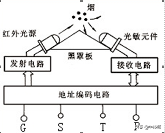 光电感烟探测器的结构图如下,当火灾初期,有烟雾产生时,烟雾进入储烟腔,光敏元件无法正常接收到红外光后,探测器发出报警。
