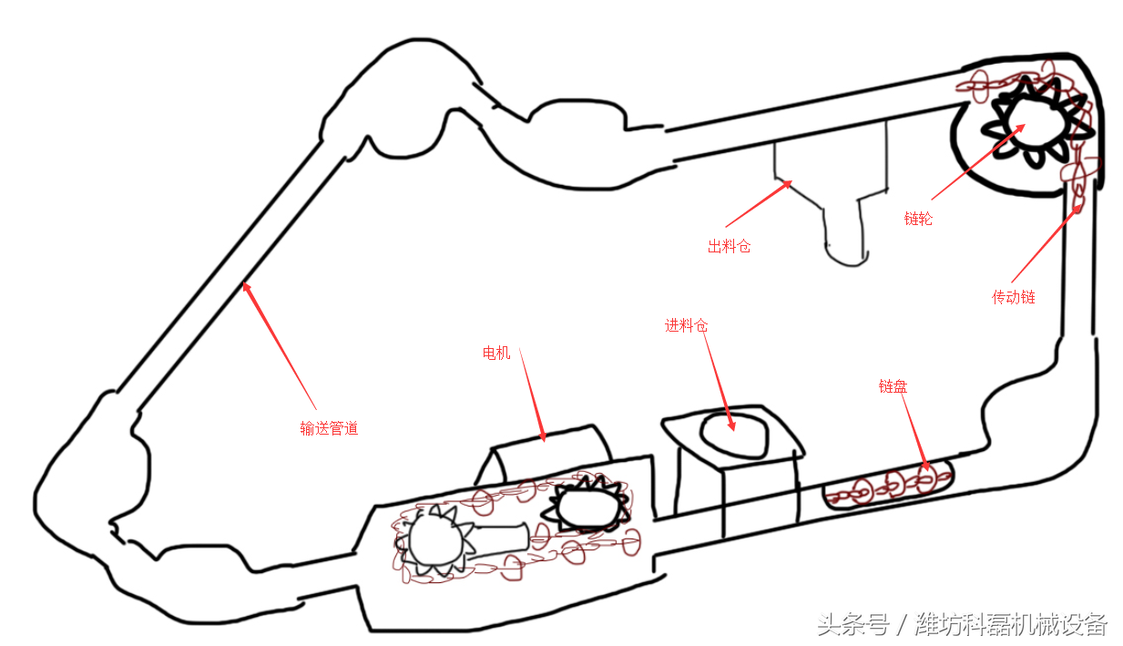 由电机带动传动链轮转动,链片为传动构件带动物料沿管道运动,从而实现连续平稳的料流。