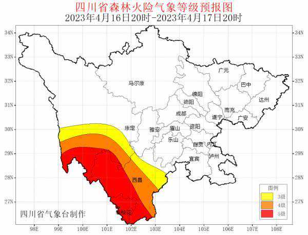 据最新气象资料分析:预计4月15日20时—18日20时攀西地区西部、南部和甘孜州西南部以晴间多云天气为主,降水稀少,空气干燥,森林火险气象等级为4—5级。请相关州市加强火源管理,做好森林防火工作。