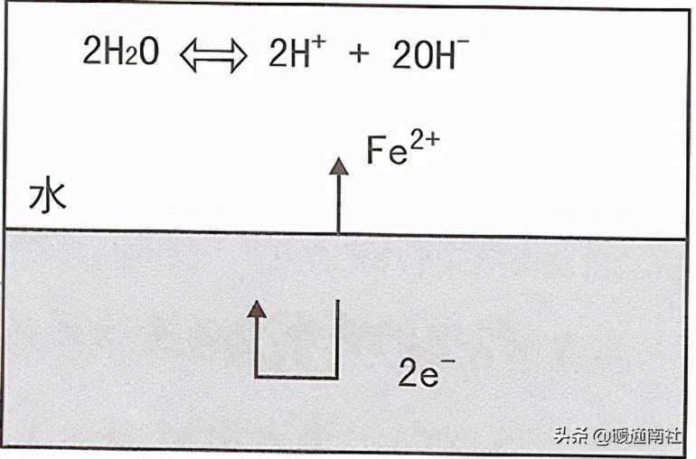 在离子化倾向高的区域Fe原子留下两个电子(2e)变成铁离子(Fe2+)溶解到水中。