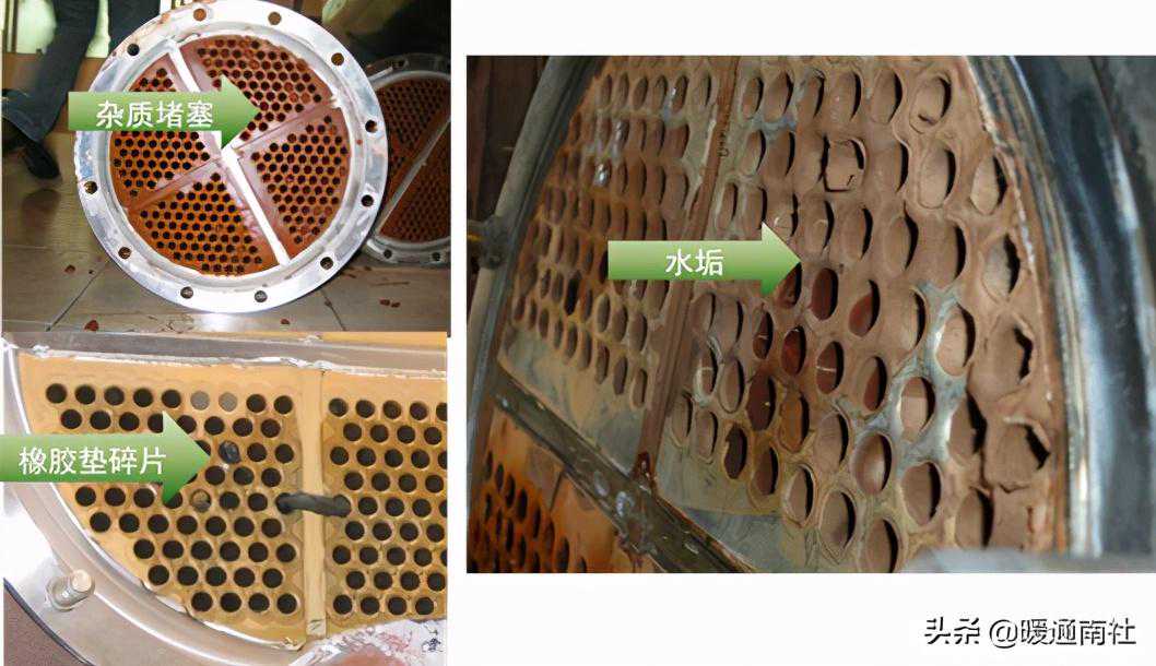 原因:系统没有过滤器,换热管堵塞;水垢多。