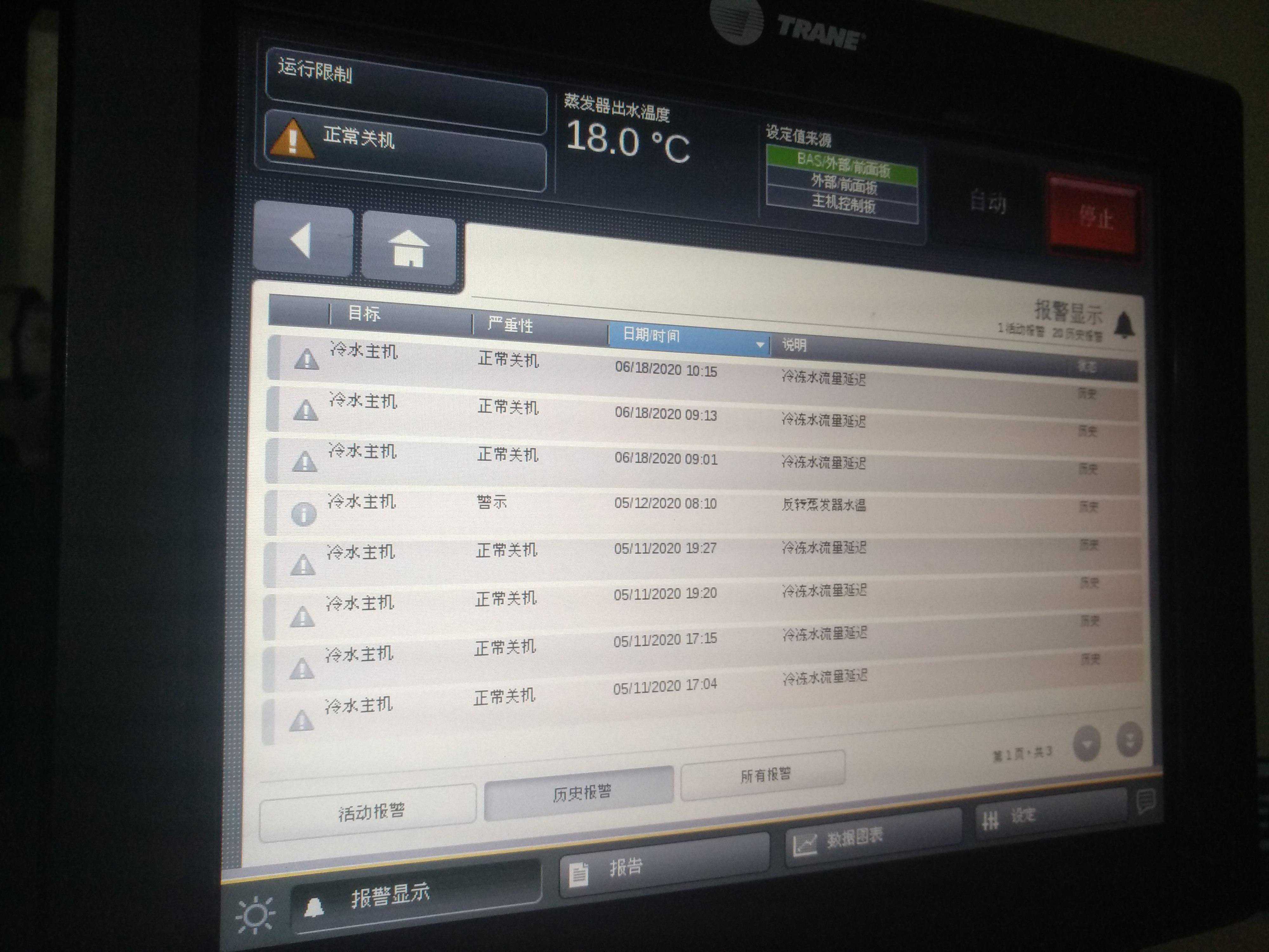 图4、制冷机水流中断后,系统自动报警停机