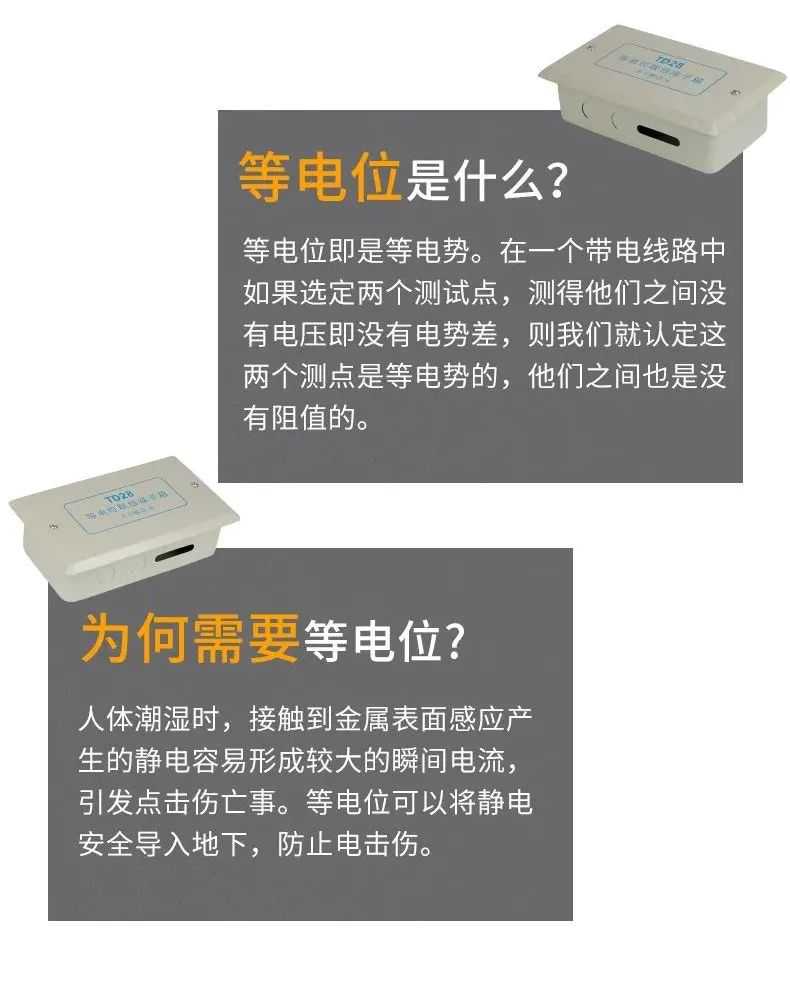 等电位联接端子箱将建筑物如高层住宅、医院、泳池等内的钢筋网,配电盘中的PE线端子、插座、上下水管、暖气管道,煤气管道,卫生间的金属浴盆、浴架、淋浴器扶手、电冰箱、空调、导电地板的金属网络将其联接到各自的等电位联接端子箱内的端子板上,从而构成各自的等电位体,保护人和设备的安全。