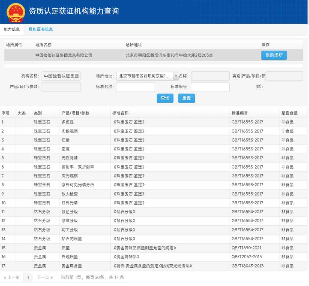 不过,界面新闻在国家市场监督管理总局下设的资质认定获证机构能力查询系统查询发现,并无编号为1的CMA检验检测机构资质认定证书,仅有一条编号为230020343681的证书信息,其对应的“能力信息”栏显示,中检北京公司所开展的鉴定业务确有17项,但这17项属于“珠宝玉石”“钻石分级”和“贵金属”3个类别。并无建筑材料质量鉴定、电器产品质量鉴定等分类信息。在中检北京公司的网站上,公布有包括编号为1在内的6份资格证书和证明,但有3份已明确显示过期。