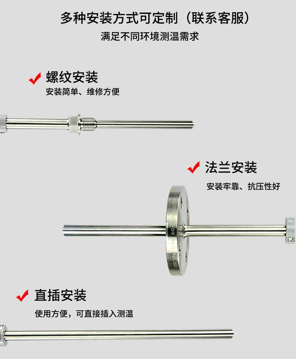 装配式热电阻是一种温度传感器,利用物质在温度变化时,其电阻也随着发生变化的特征来测量温度的,可直接用铜导线和二次仪表相连接使用。当阻值变化时,工作仪表便显示出阻值所对应的温度值。它比装配式铂电阻直径小,易弯曲,适宜安装在管道狭窄和要求快速反应、微型化等特殊场合。装配式热电偶作为温度测量传感器,通常与温度变送器、调节器及显示仪表等配套使用,组成过程控制系统,用以直接测量或控制各种生产过程中0-1800℃范围内的流体、蒸汽和气体介质以及固体表面等温度。铠状热电偶具有能弯曲、耐高压、热响应时间快和坚固耐用等许多优点。