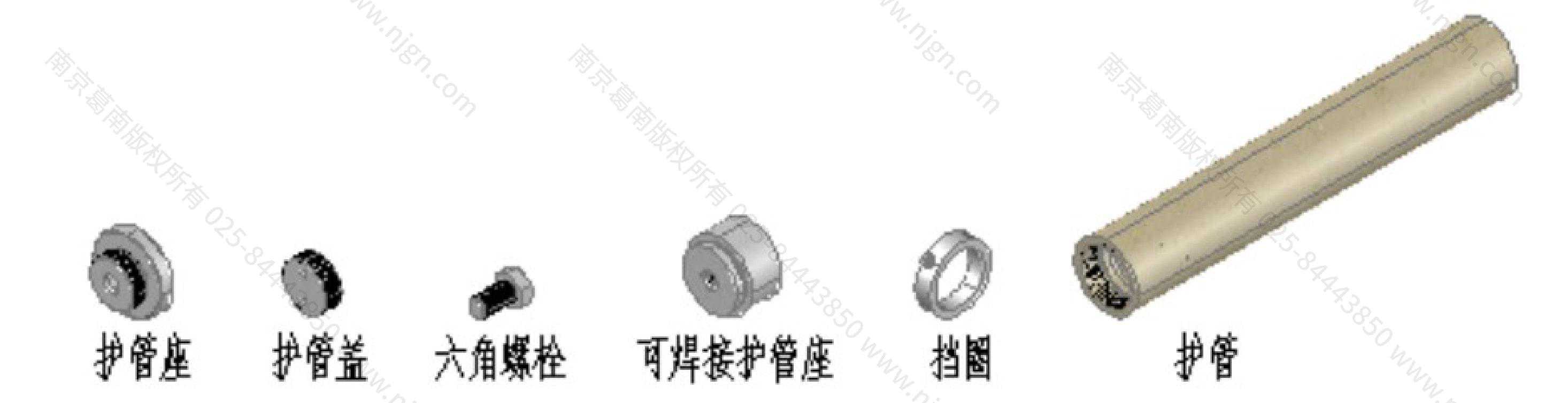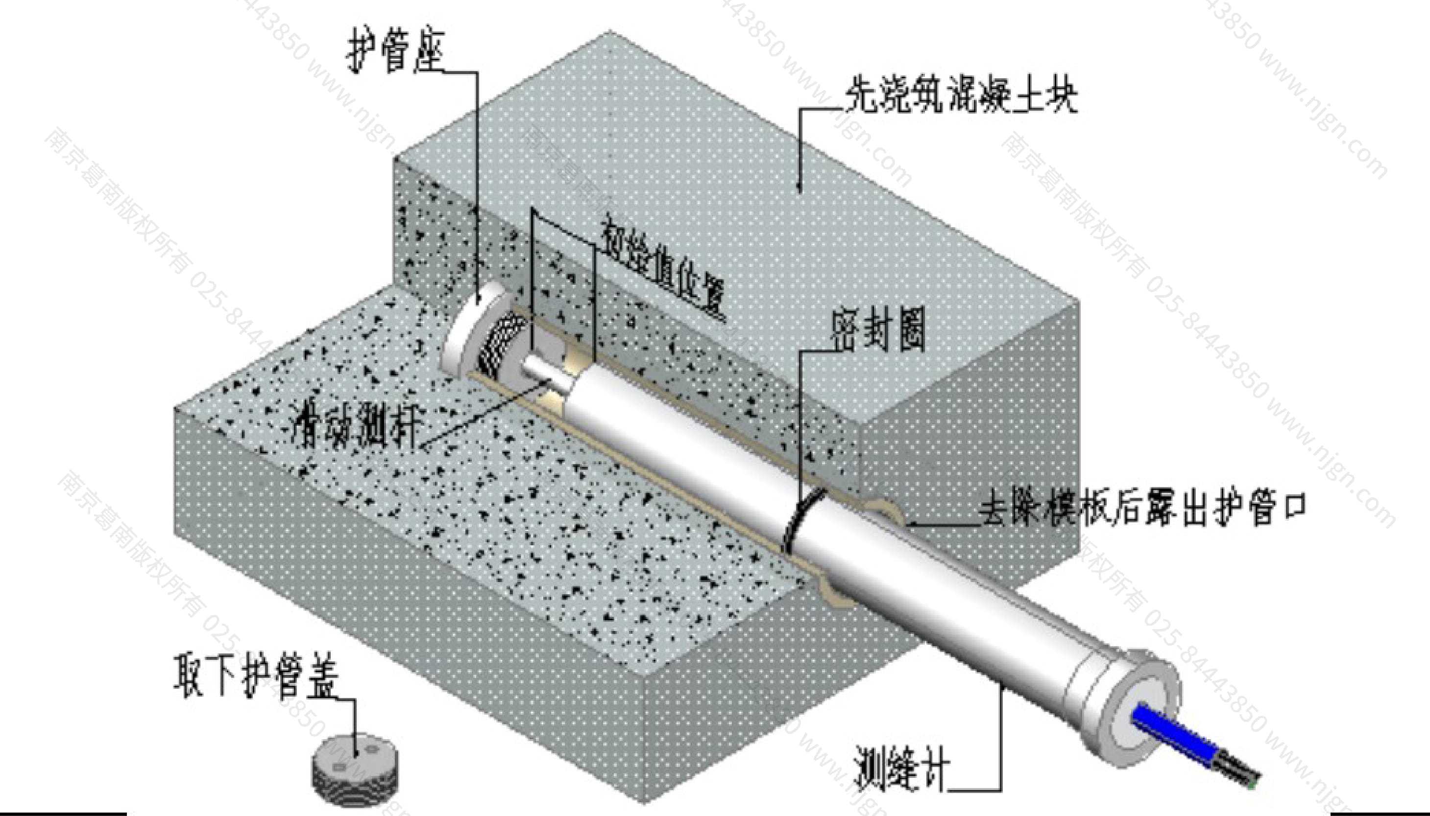 用。护管盖和六角螺栓只适用在浇筑模板上固定护管时使用,浇筑模板拆除后弃用。其它附件随测缝计埋入被测构件中。