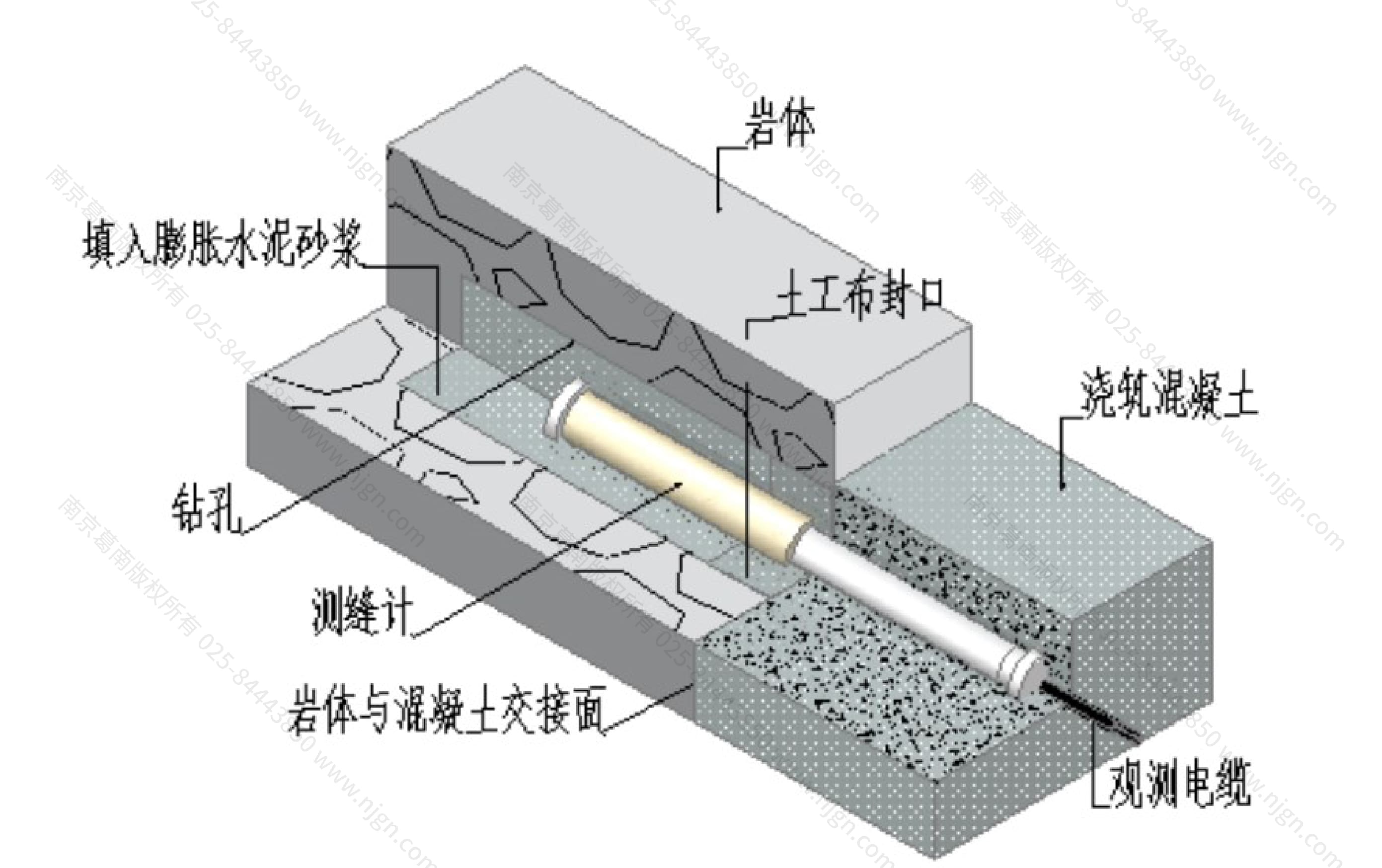 开合变化时测缝计就能测量出其变化量。浇筑混凝土前应合理敷设和保护观测电缆(如下图所示)