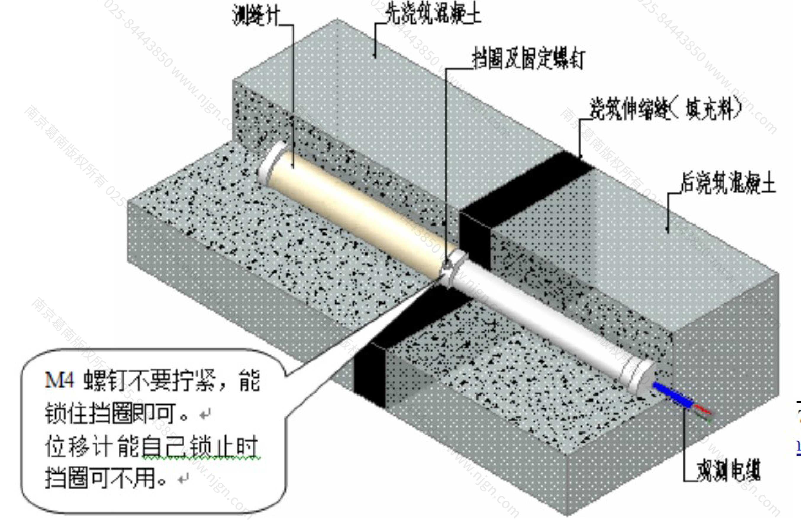 使用挡圈时为便于伸缩缝压缩变形时挡圈与位移计之间能容易相对滑移,M4固定螺钉不要拧紧,只要能锁住位移计即可(如下图所示)