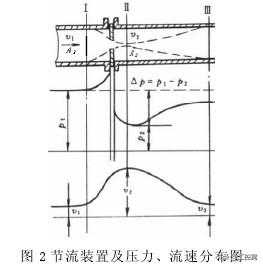 在径向压差的作用下,流体产生径向加速度,从而使靠近管壁处的流体质点的流动方向倾斜于管道中心轴线,出现缩脉现象.由于受到惯性作用,流速的最小截面并不在节流装置的孔口处,而是经过节流装置之后仍继续收缩,到截面Ⅱ处流速达到最小,此时流速大,即v2,之后流速又逐渐扩大,至截面Ⅲ后完全恢复,流速逐渐降到原值,即v3=v1.