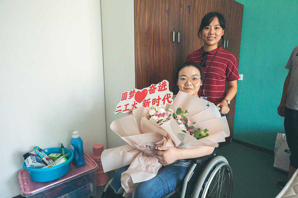 在所居住的爱心小屋,女孩奚懿璇静静地坐在轮椅上,对学校所做的人性化举措、助力自己圆了大学梦表示感激。和其他女孩一样,她有自己的喜好,有喜欢看的书籍和节目,有想学的乐器。懂事的她深知父母的艰辛,家里9岁的弟弟还在读小学,母亲要开小店维持家用还要照顾好弟弟。谈及未来,奚懿璇的目光中透露着坚定,她表示会更加努力地学好专业知识,多看书多开拓眼界,回报给予她关爱与帮助的人。