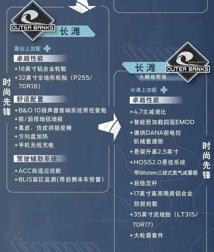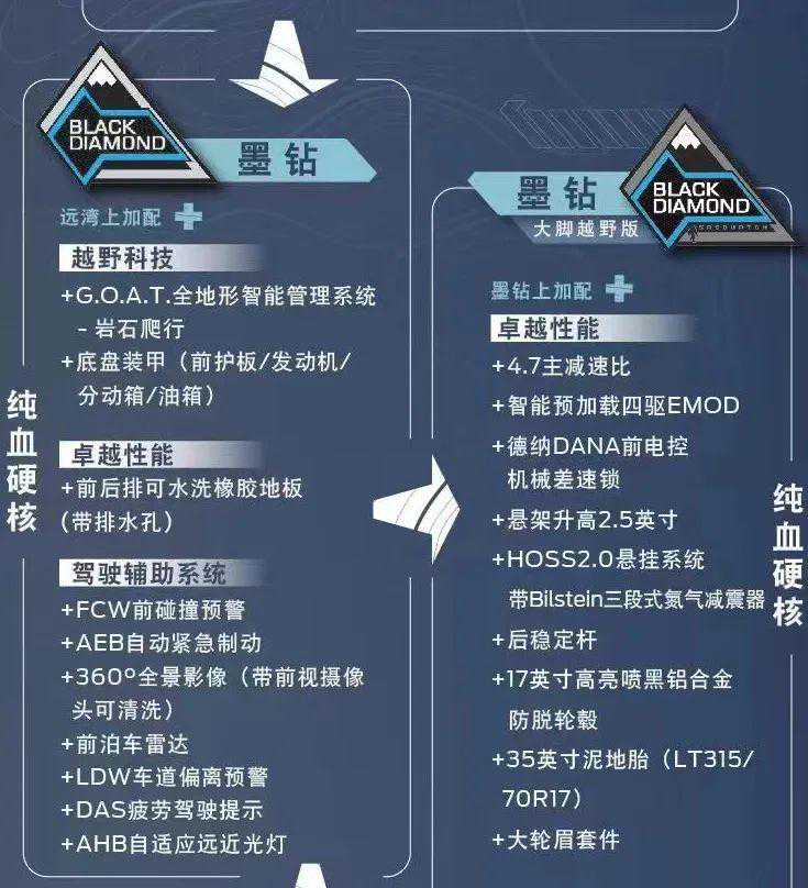 墨钻作为中配车型,相比远湾的全地形系统增加了岩石模式、底盘护板、带排水口的车内地板、可选装的拖挂资质以及一系列的驾驶辅助系统,可以说从墨钻开始才是真正的烈马。最重要的是从此配置开始才能选原厂大脚包,这个可以说是非常重要,我预计大概会价值3-4万元左右。作为参考,烈马在北美市场选装大脚包的价格为8000美金左右。