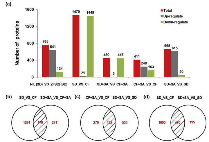 图18不同比较组间(a-d)表达水平有统计学差异的蛋白质在水稻籽粒中的分布(Kimbembeetal.,2020)。结果显示,在765个差异表达蛋白中,与浙富802(SD)相比,NIL(SD)中有641个蛋白显著上调,124个蛋白显著下调。