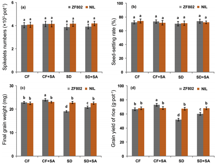 图15土壤干燥(SD)和水杨酸(SA)不同处理下浙富802及其近等基因系(NIL)的籽粒重量和产量统计(Kimbembeetal.,2020)。(a)每株水稻的总稻穗数。(b)结实率。(c)籽粒重量。(d)产量。