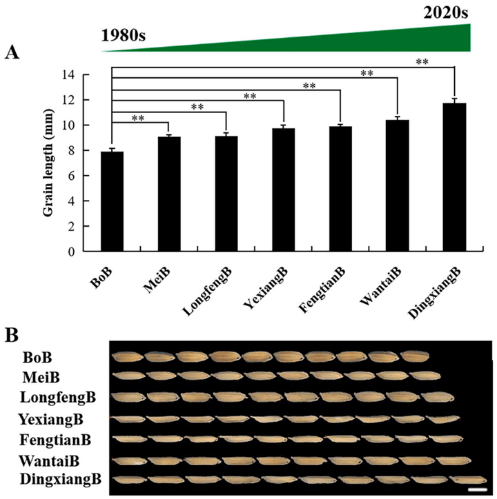 图3不同品种大米粒长测定(Qingetal.,2023)。(A)谷粒长度。(B)各品种籽粒长度比较。