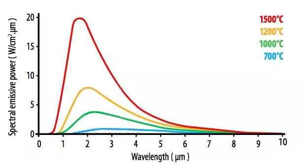 反映到图里就是,1500℃的红色高温曲线,在每段波长上强度都比1200℃的黄色曲线高: