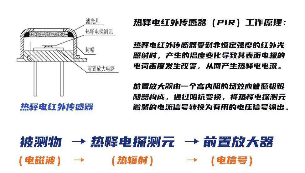 这个能将接收到的“红外电磁波辐射”转换为“热辐射”(黑体辐射过程),进而把“热辐射”转化为电信号(热电转化过程)的东西就是:热释电红外传感器(简称:PIR)