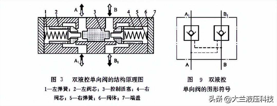 反之,液压系统一条油路的液流从B腔正向进入该阀时,液流压力自动顶开右阀芯4,使B腔与B1腔沟通,油液从B腔向B1腔正向流通。同时,液流压力将中间的控制活塞3左推,从而顶开左阀芯2,使A腔与A1沟通,将原来封闭在A腔通路上的油液经A腔排出。概括起来,双液控单向阀的工作原理是当一个油腔正向进油时,另一个油腔为反向出油,反之亦然。而当A腔和B腔都没有液流时,A1腔与B1腔的反向油液在阀芯锥面与阀座的严密接触下而封闭(液压锁作用)。图9所示为双液控单向阀的图形符号。