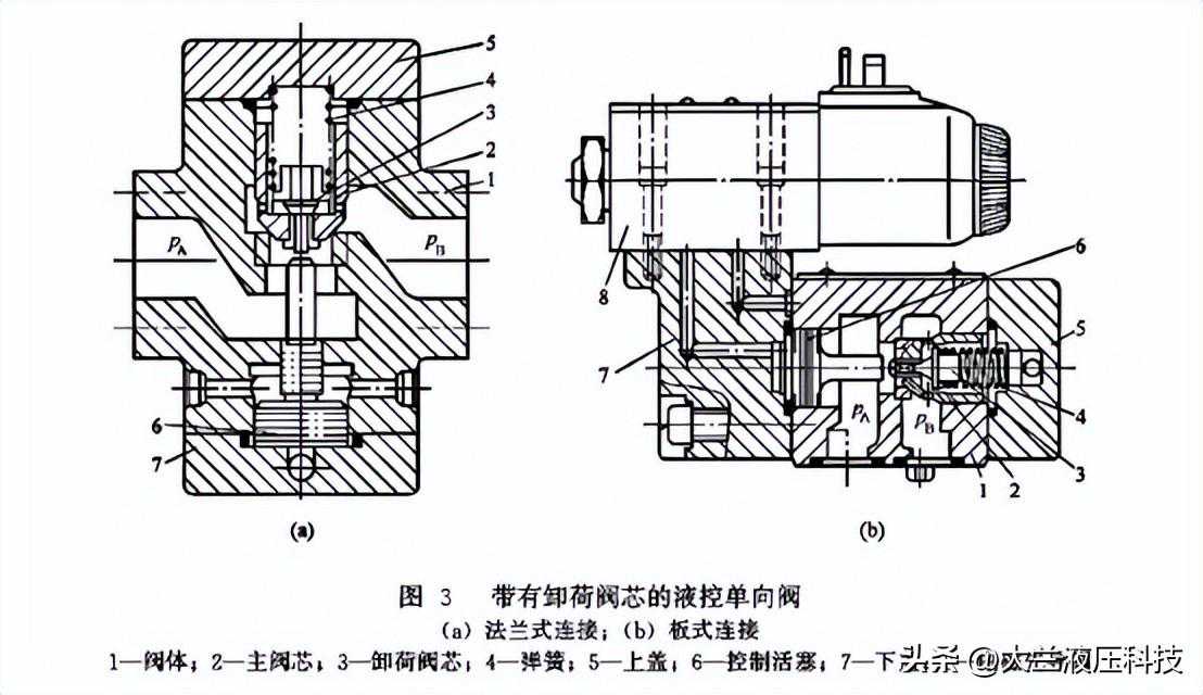 图3所示为带有卸荷阀芯的液控单向阀,其中图3(a)的连接方式为法兰式,图3(b)的连接方式为板式带有电磁先导阀。