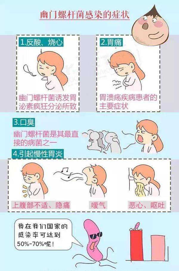 慢性胃炎:Hp检出率54%~100%,慢性活动性胃炎Hp检出率为90%以上。不仅引起胃窦炎,也可引起胃体底炎,临床表现无特征性,常见上腹部疼痛、不适、饱胀、嗳气等上消化道症状。