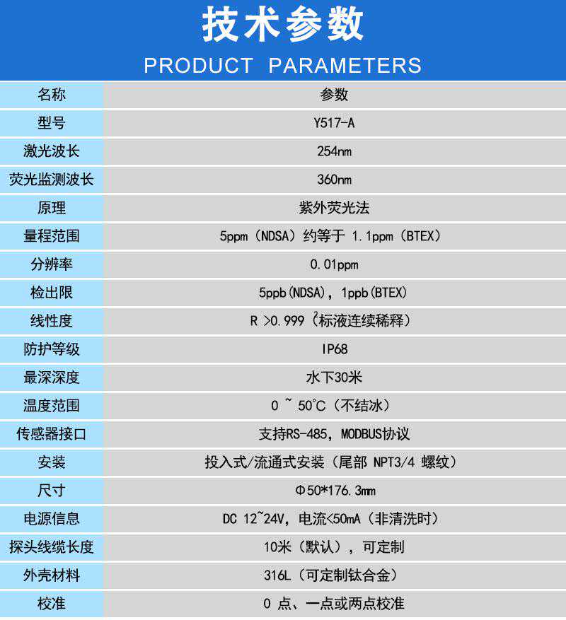 禹山紫外荧光法自清洁水中油传感器介绍: