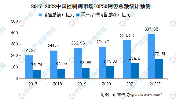我国控制阀市场参与主体较多,聚集了多家国内外知名企业,行业市场化程度较高,竞争较为激烈。数据显示,2021年度国内控制阀行业总销售额超过350.00亿元,前10名销售厂商销售额共计196.92亿元,前50名厂商销售额共计333.53亿元。