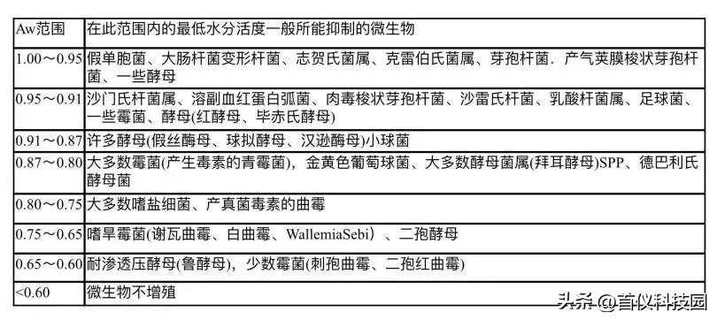 微生物的生长与水分活度密切相关,不同类型的微生物均有最低水分活度要求,当药品的水分活度低于此临界值时,该类型的微生物将无法生长。革兰阴性菌铜绿假单胞菌、大肠埃希菌、沙门菌属、洋葱伯克霍尔德菌的最低水分活度分别为0.97,0.95,0.95,0.95;革兰阳性菌金黄色葡萄球菌的最低水分活度为0.86;芽孢杆菌属蜡样芽孢杆菌和枯草芽孢杆菌的最低水分活度分别为0.95和0.80;真菌白色念珠菌和黑曲霉的最低水分活度分别为0.87和0.77;最耐高渗酵母菌和耐旱真菌的水分活度低于0.60时无法增殖。
