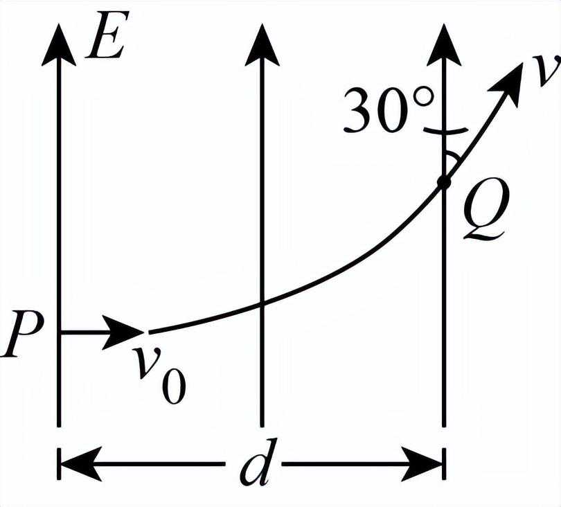 7、如图所示,一带电荷量为的带电粒子以一定的初速度由点射入匀强电场,入射方向与电场线垂直.粒子从点射出电场时,其速度方向与电场线成角.已知匀强电场的宽度为,、两点的电势差为,不计重力作用,设点的电势为零.则下列说法正确的是