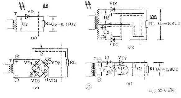 用4个二极管组成的桥式整流电路可以使用只有单个次级线圈的变压器,见图2(c)。负载上的电流波形和输出电压值与全波整流电路相同。