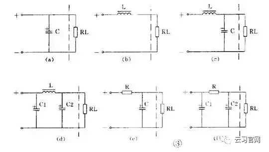 电感器的成本高、体积大,所以在电流不太大的电子电路中常用电阻器取代电感器而组成RC滤波电路。同样,它也有L型,见图3(e);π型,见图3(f)。