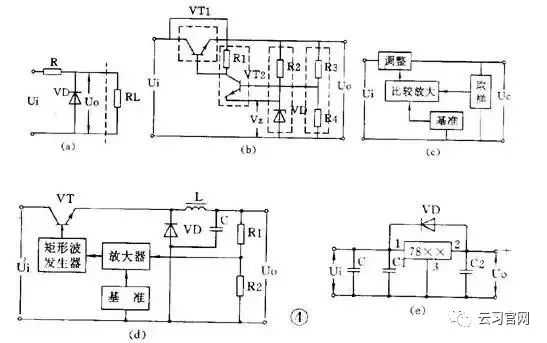 用一个稳压管和负载并联的电路是最简单的稳压电路,见图4(a)。图中R是限流电阻。这个电路的输出电流很小,它的输出电压等于稳压管的稳定电压值VZ。