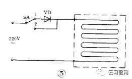 图5是一个电热毯电路。开关在“1”的位置是低温档。220伏市电经二极管后接到电热毯,因为是半波整流,电热毯两端所加的是约100伏的脉动直流电,发热不高,所以是保温或低温状态。开关扳到“2”的位置,220伏市电直接接到电热毯上,所以是高温档。
