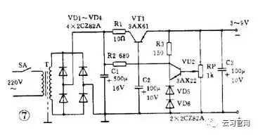 图7是一个实用的稳压电源。输出电压3~9伏可调,输出电流最大100毫安。这个电路就是串联型稳压电源电路。要注意的是: