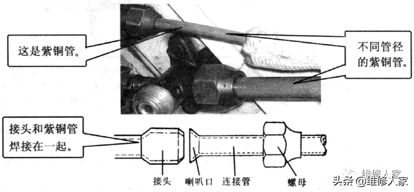 通常接头和紫铜管焊接在一起,而接头螺母应先套在紫铜管上,然后将铜管扩成喇叭口,最后将螺母拧紧在接头上,喇叭口与接头锥面要对正,否则极易造成制冷剂泄漏。