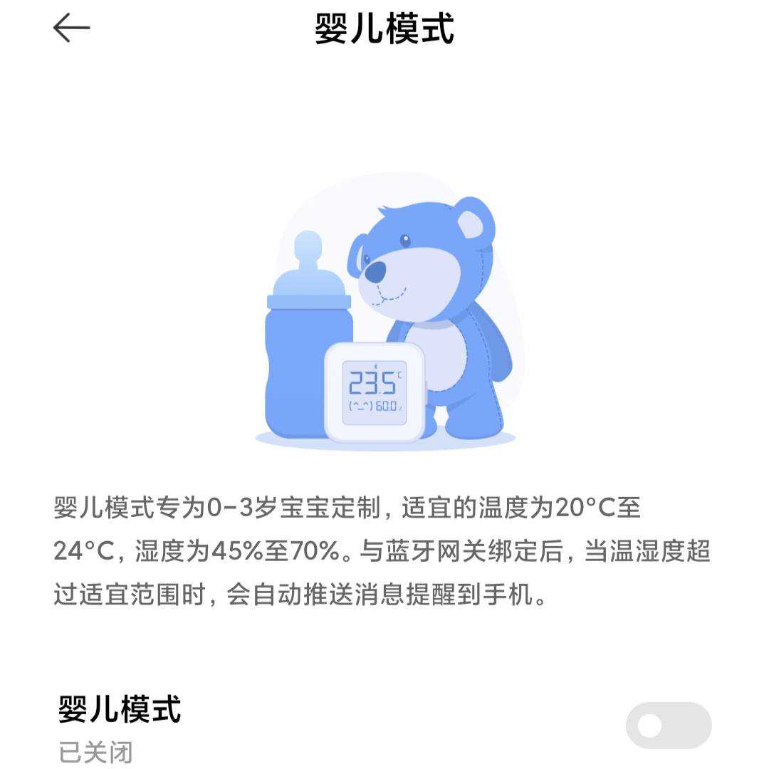 心细的我发现,小米电子湿温度计还拥有婴儿模式,设置了适合婴儿的室内湿温度范围。如果不在这个适宜范围内,会推送到宝爸宝妈的手机,真的不要太贴心啦!强烈推荐给能够看到这篇文章的宝爸宝妈们,当然我们也可以设置适合自己的湿度与温度。