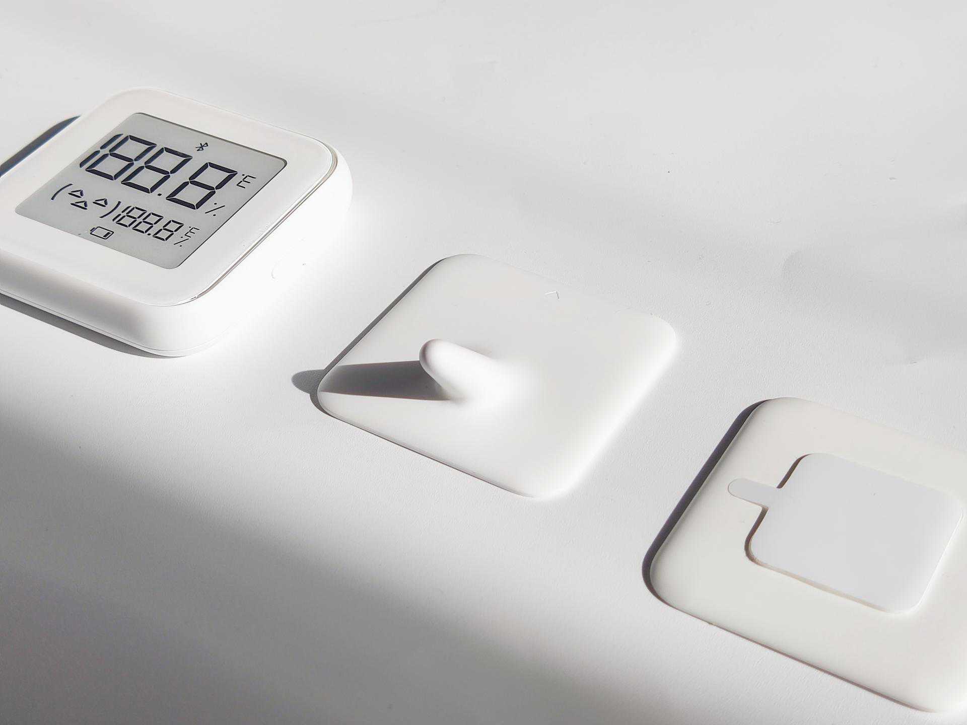 包装一如既往的小米极简风格,打开外包装,我们可以看到主体“湿温度计”、还有墙贴、支架与说明书。其实外包装没有什么好讲的,直接来看这款湿温度计的外观方面的设计。