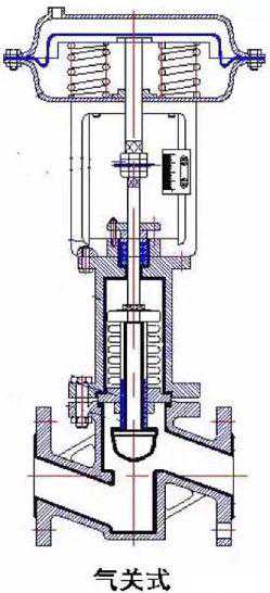 气关式执行机构在输入信号增加时,在薄膜膜片上产生一个推力,克服弹簧的作用力后而将阀门关闭。如图: