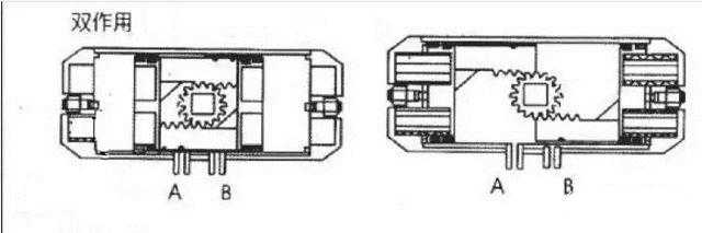 当压缩空气从A管咀进入气动执行器时,气体推动双活塞向两端(缸盖端)直线运动,活塞上的齿条带动旋转轴上的齿轮逆时针方向转动90度,阀门即被打开。此时气动执行阀两端的气体随B管咀排出。反之,当压缩空气从B官咀进入气动执行器的两端时,气体推动双塞向中间直线运动,活塞上的齿条带动旋转轴上的齿轮顺时针方向转动90度,阀门即被关闭,此时气动执行器中间的气体随A管咀排出。