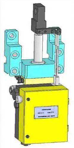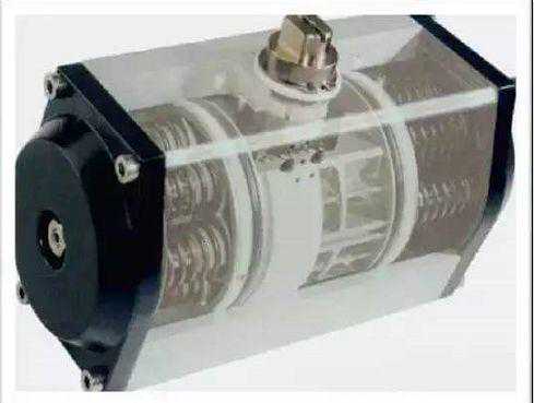 气动活塞式执行机构,以控制气作为动力,推动活塞在汽缸里运动,输出轴产生转角位移或直行程位移,活塞式执行机构可在活塞上施加较大的控制气压,所以可做成比薄膜执行机构更大推力或更大力矩的执行机构,而且,其相对的体积还可以做得较小。如图: