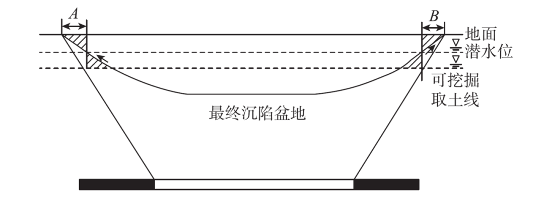 通过传统稳沉后非充填复垦和边开采边修复所恢复土地率的对比分析,阐述边开采边修复的基本原理。图3-5为下沉稳定后采用非充填复垦时土地恢复示意图,在不考虑外来土源的情况下采用挖深垫浅等措施,可在沉陷盆地的边缘区域复垦出部分土地,即A与B区。