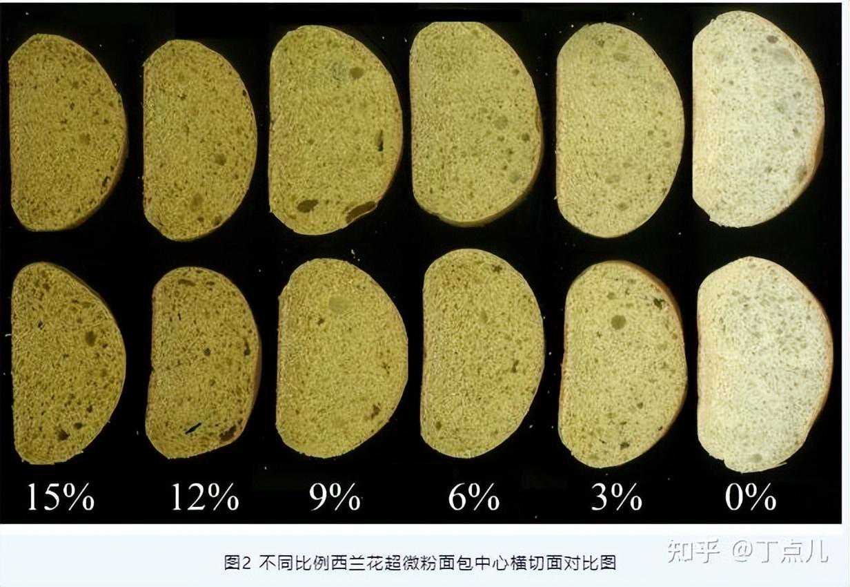 有研究者对西兰花超微粉对面包相关指标的影响进行了研究,研究结果表明添加西兰花超微粉能够增加面团的弹性模量和粘性模量,但是面团的固有流变性没有改变;适当比例的西兰花超微粉对面包的体积非常重要,添加大量的西兰花超微粉会使面包心硬度增加、缺乏弹性且粘牙,对产品品质的影响较大。
