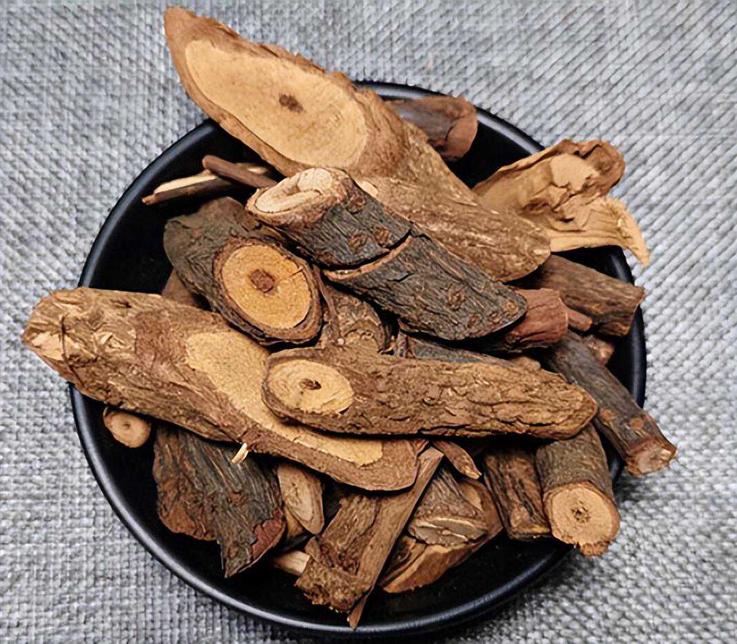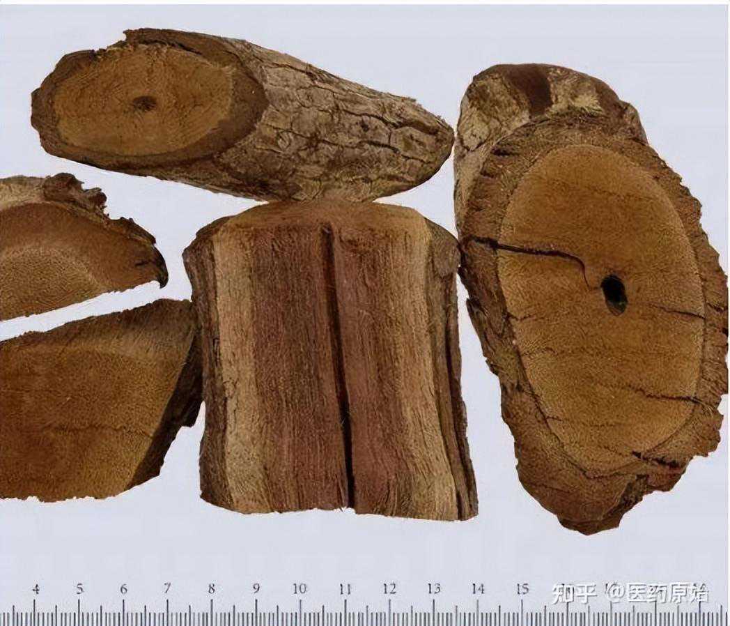 【性状】本品呈圆形、椭圆形或不规则的斜切片,直径1.8~6.5cm。表面灰棕色,栓皮剥落处呈暗红紫色,栓皮较厚,粗者具多数裂隙,呈龟裂状;细者具纵沟,常附有苔类和地衣。质坚硬,不易折断。横切面皮部窄,红棕色,纤维性强。木部宽,浅棕色,有多数细孔状导管。髓部小,黑褐色,呈空洞状。具特异香气,味苦而涩。