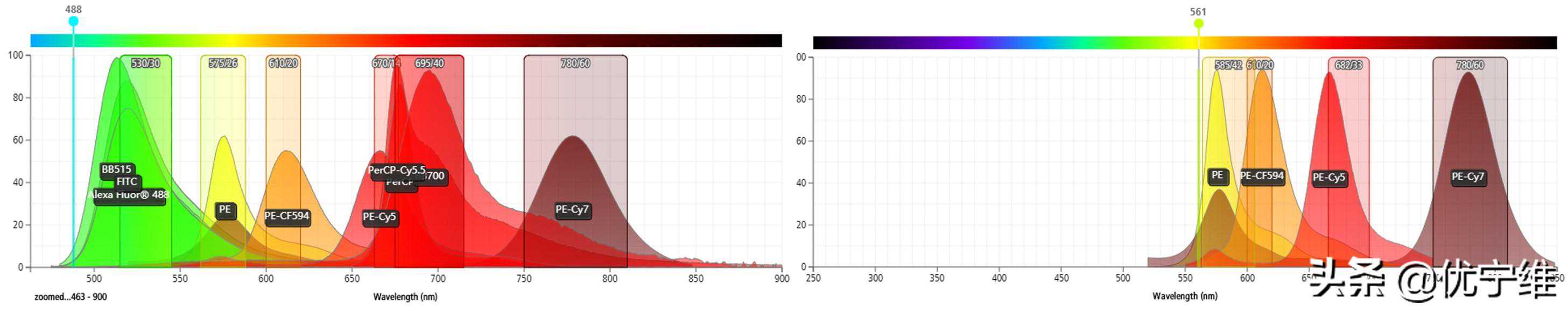两张荧光素强弱对比图,是在两台商用流式仪器上完成的验证结果。由于每种仪器在激光功率和检测光学中都是独特的,因此最好抗原在每个仪器都有相对的荧光亮度。所以将荧光色素亮度分为四类(例如,APC-H7串联染料在标度的低端,或BV421和pe串联染料在标度的上端)
