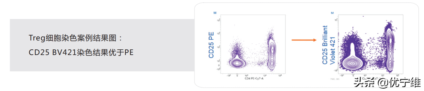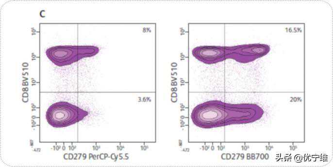 BDHorizonBV421的亮度相当于PE或比PE还要亮,比PacificBlue的10倍更亮,有更好的分辨率,是弱表达抗原的第一选择,让PacificBlue通道变得wonderful。
